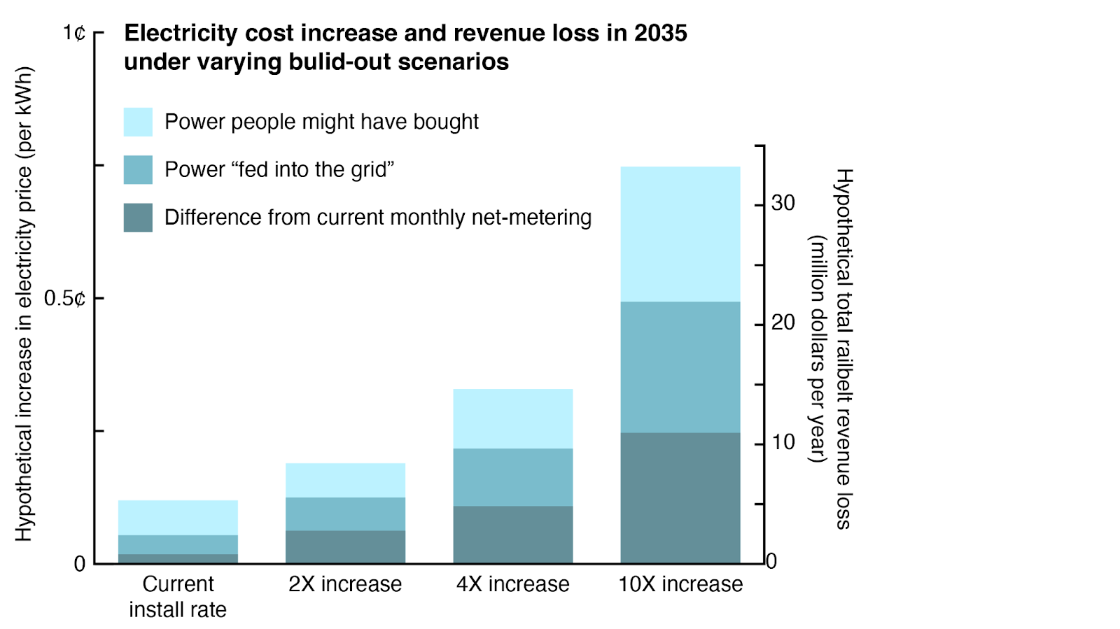 In the ‘current installation rate’ scenario I assumed that the percentage of net metering and overproduction equals that of today. In the increased installation scenarios, I assumed only 1/3 of power was self-consumed, with 1/3 each over produced or consumed within the month, to account for larger installations being incentivized.