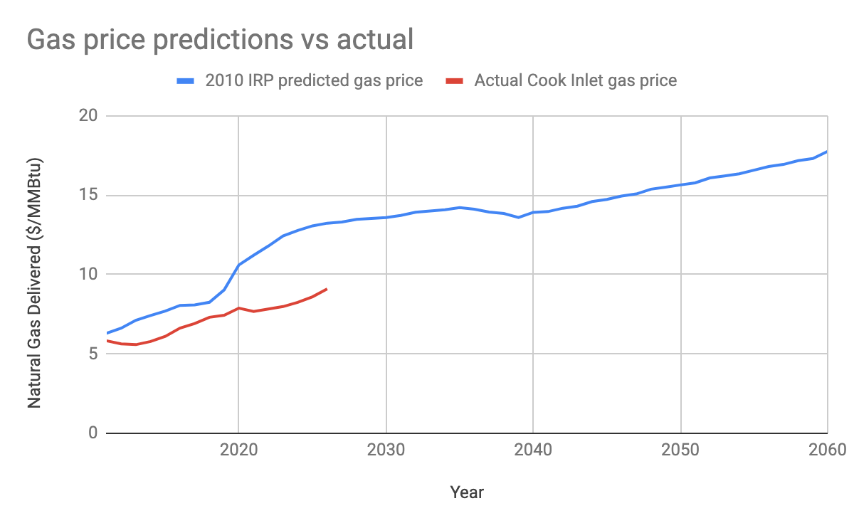 The plan made a lot of wrong assumptions. Some of them were egregiously wrong -- like the idea that every large barely-sketched-out energy project would be feasible, and that we could pay for them all. Some of them were more understandably wrong, like forecasts that predicted load would grow rather than shrink, that gas prices would rise more quickly, and that we’d figure out some other source of gas beyond Cook Inlet. Predicting the future is hard, but ideally, you’d have thought through your assumptions and sensitivities well enough that the edges of your ranges would at least end up overlapping with reality.