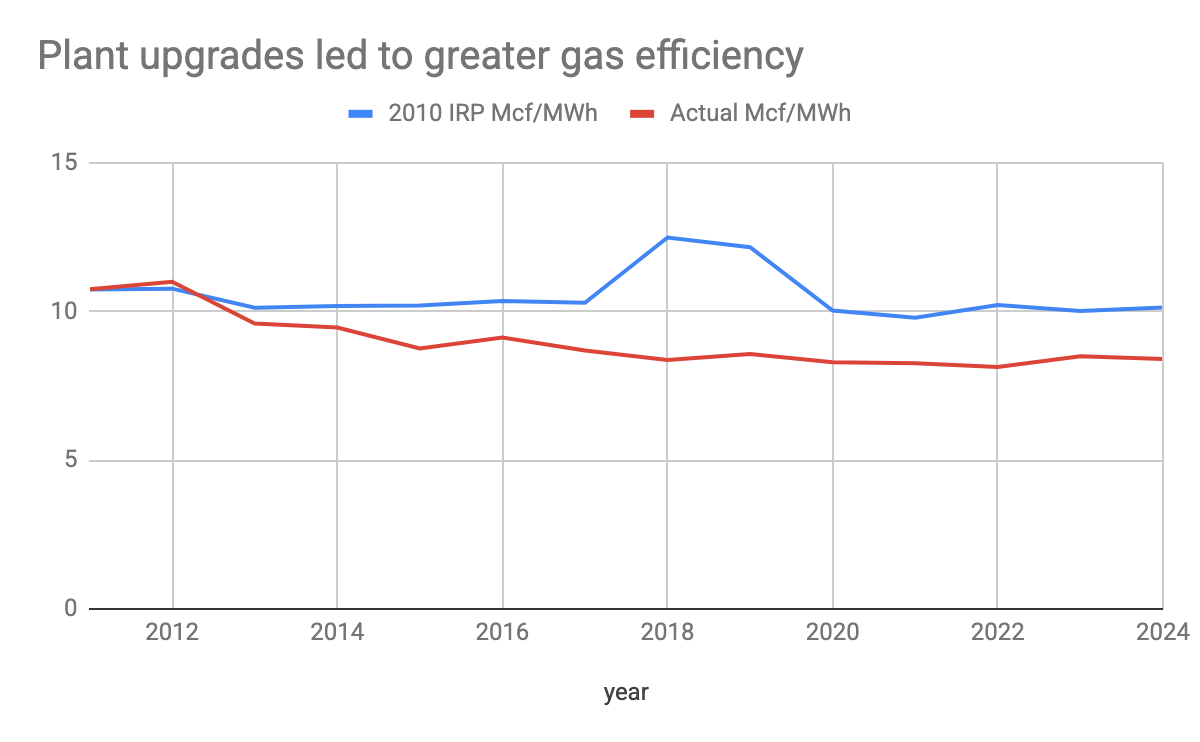 Gas use in reality was nearly exactly the same as it would have been under the plan. Where the plan anticipated load growth and new power sources, we got more efficient gas generation and a shrinking load.
