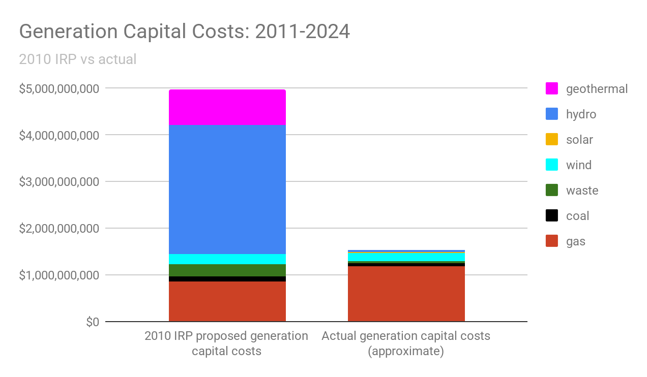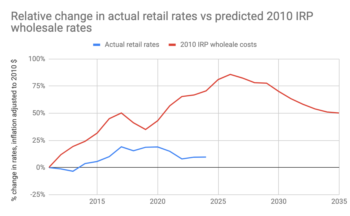 The plans built more stuff than we actually did, for a load bigger than we actually have - the result in 2026 would have been a power cost higher than we pay today. Those costs were front loaded and expected to decrease into the future, but to remain above 2010 costs. In contrast, inflation-adjusted bills have risen around 8% for the average household. The plan depended heavily on large hydro and geothermal projects later determined to be infeasible. It assumed we’d have a gas line already, and that gas would be both more expensive and more available.