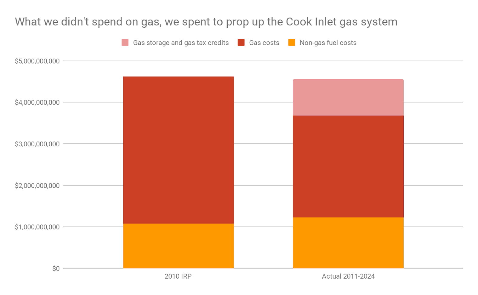 All the new gas infrastructure made gas power more efficient than envisioned in the 2010 plan. If we’d produced the same amount of power with the older plants, we would have spent somewhere around $450 million more on gas (using Cook Inlet average prices rather than evaluating utilities’ actual fuel costs, and excluding post-upgrade savings attributed to utility consolidation and power pooling). But those savings are still only a little over a third of what those plants cost.