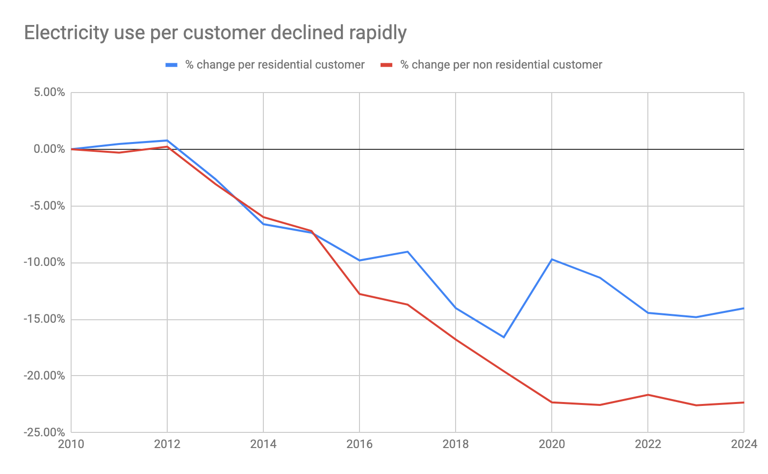 The state did spend over $600 million on energy efficiency in that time frame, through the Home Energy Rebate Program and the Weatherization Program, but those recommended measures primarily targeted heating fuel reductions. And while electric utilities didn’t spend money on electric efficiency, consumers did, reducing their use dramatically. This is why, although residential rates increased 15% over that time frame (inflation adjusted), residential bills only rose around 8%.