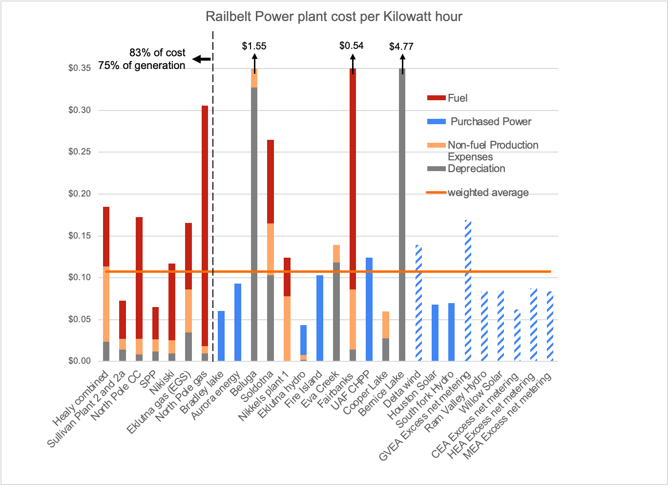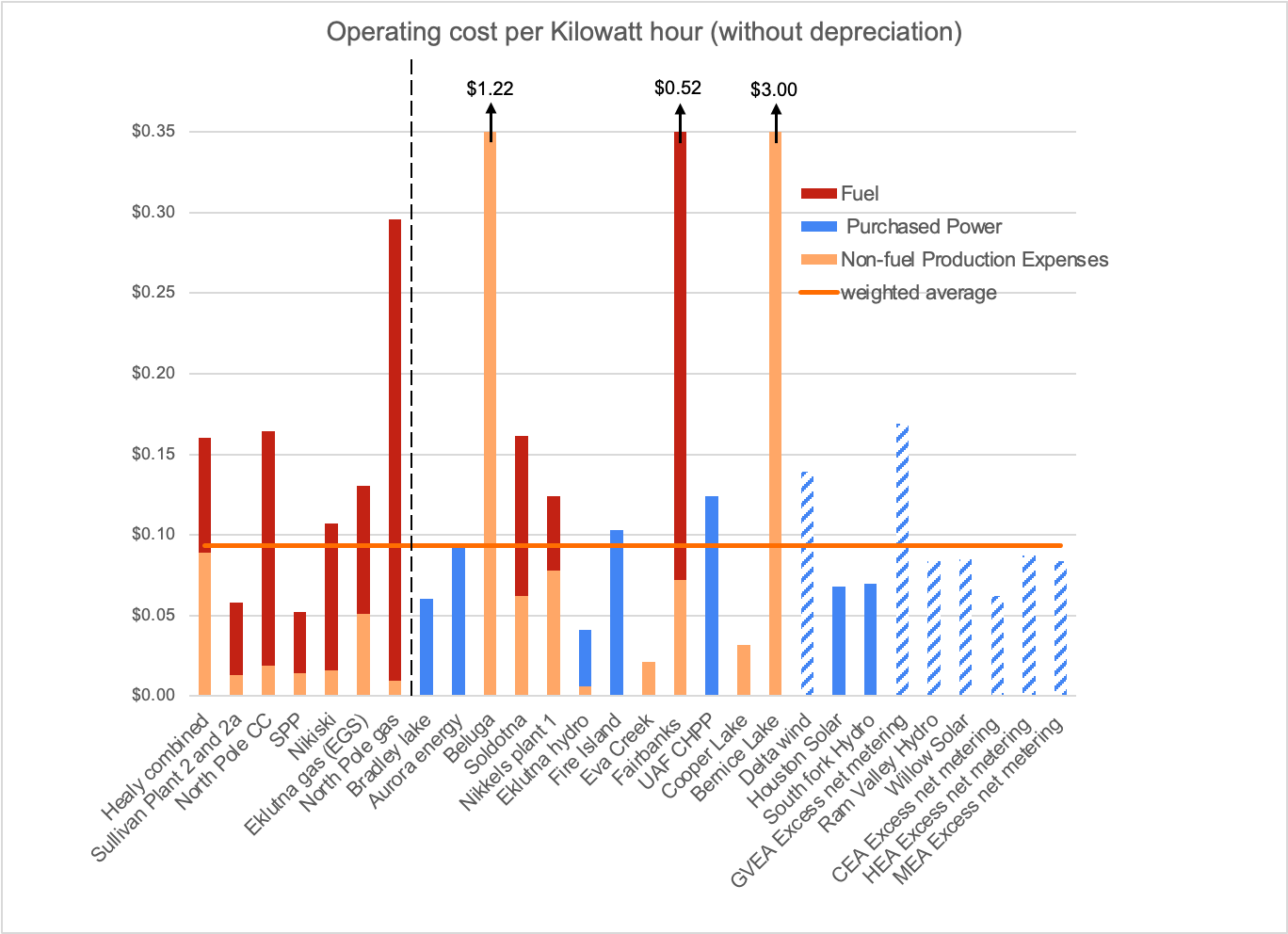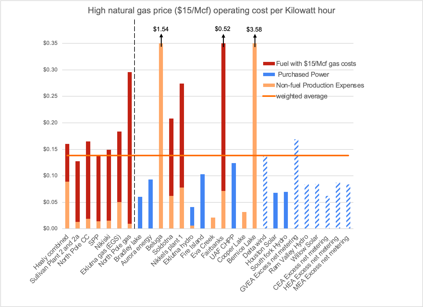 Operating and fuel costs are a moving target. All costs will increase over time, but a major current driver is the Cook Inlet gas crisis. This is what the same data would look like if all natural gas cost $15/Mcf (current costs are around $8-10/Mcf, depending on utility). The weighted average would be around 14 cents per kilowatt hour, and likely higher when shifts in operating costs and other fuel costs are included.
