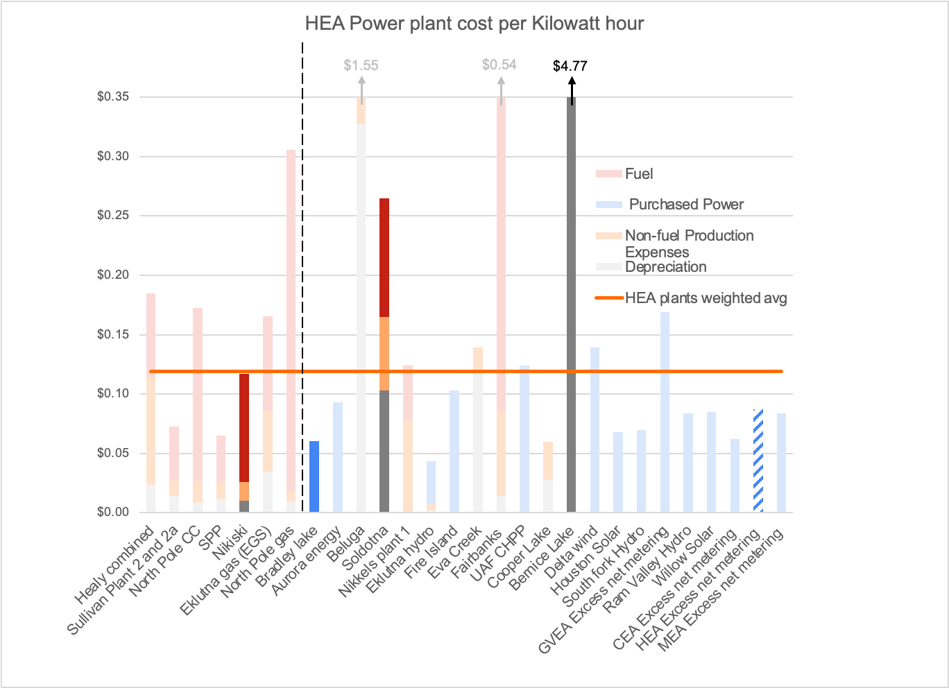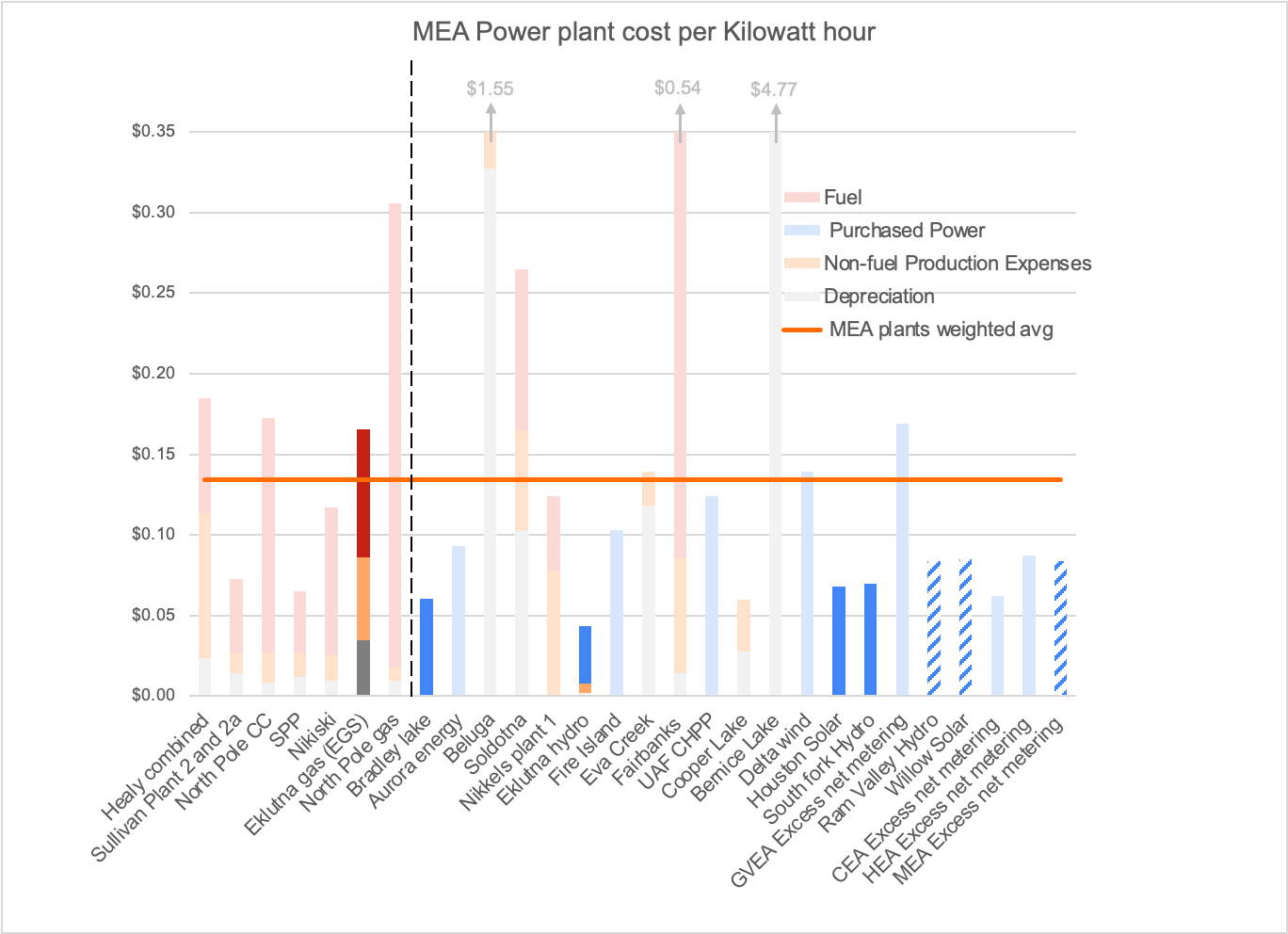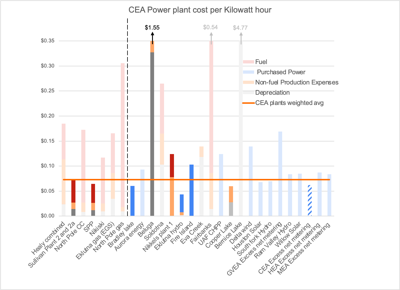 Operating and fuel costs are a moving target. All costs will increase over time, but a major current driver is the Cook Inlet gas crisis. This is what the same data would look like if all natural gas cost $15/Mcf (current costs are around $8-10/Mcf, depending on utility). The weighted average would be around 14 cents per kilowatt hour, and likely higher when shifts in operating costs and other fuel costs are included.