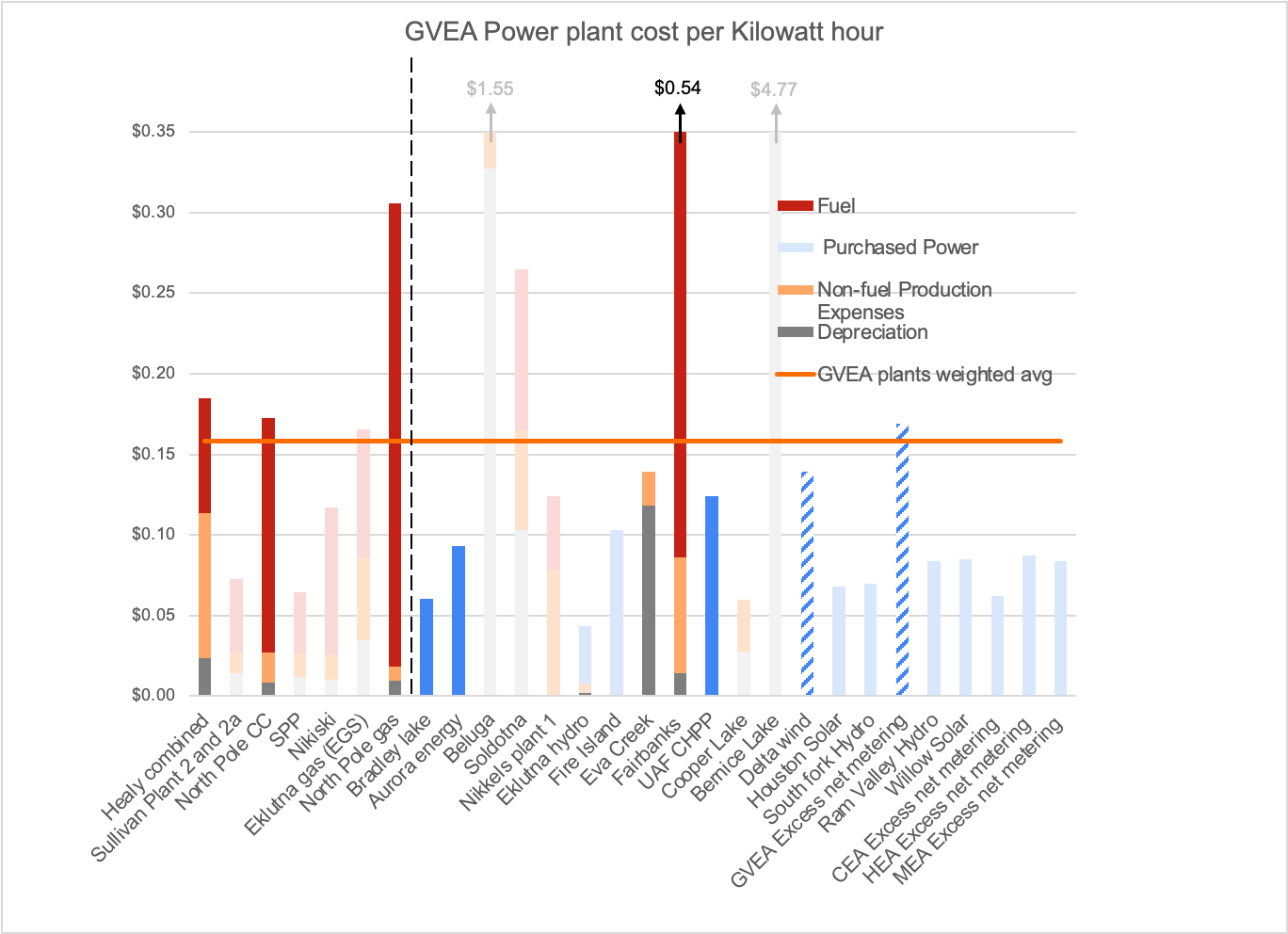 Depreciation is a useful way to think about the economic consequences of what we’ve already done, but if we want to compare new options to existing ones, it makes more sense to look at the fuel and operating costs, since those costs can still change. And those costs are all over the place. Even quite expensive new generation could pencil out immediately if it replaces very expensive GVEA generation, or the lesser used gas plants. But it would be significantly harder to match the current costs of the cheapest gas plants.