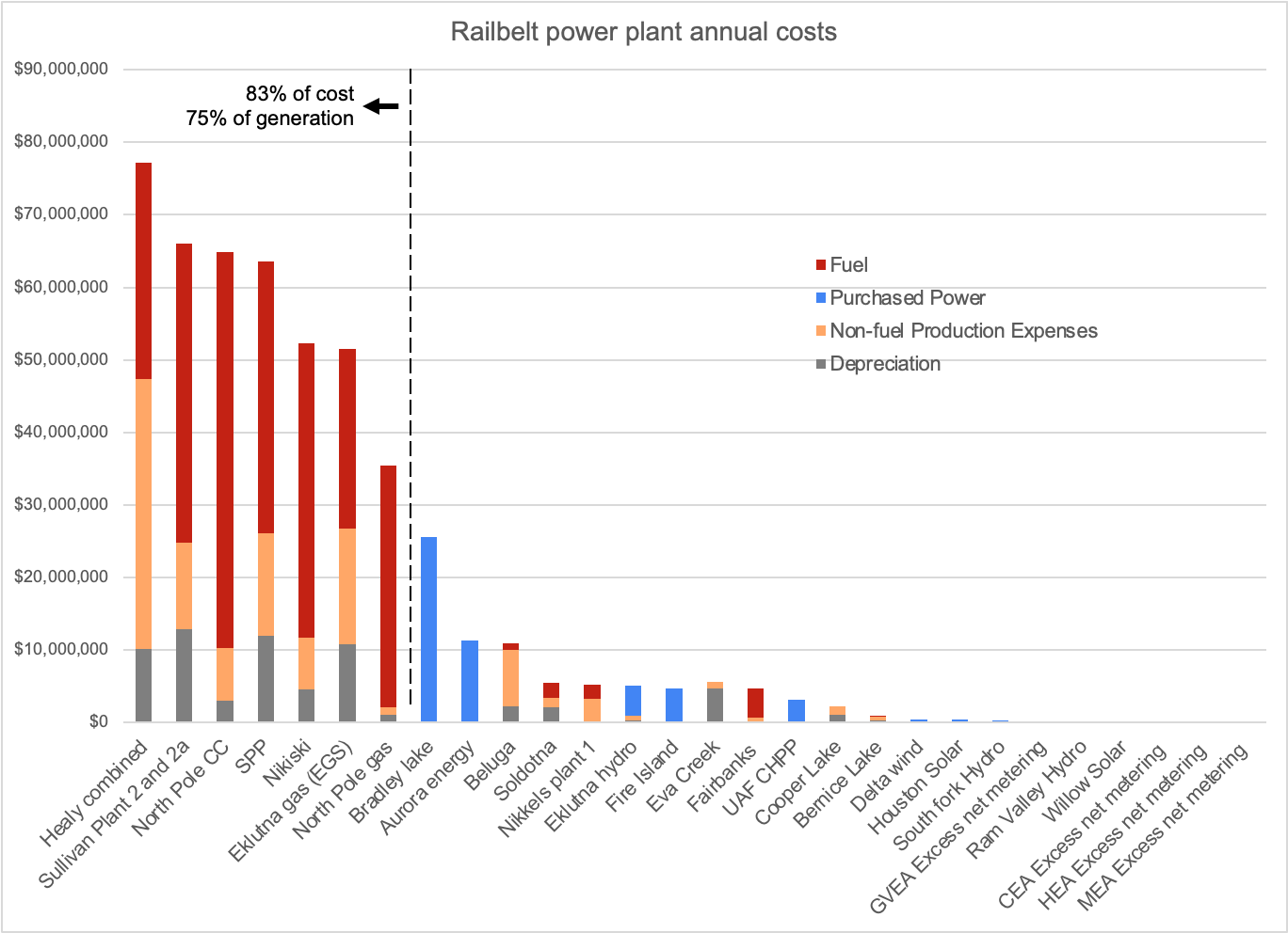 A handful of heavily-used fossil fuel plants make up a large majority of the roughly $500 million cost, and produce most of the electricity. Around $27.5 million is for backup fossil fuel plants used at less than 10% capacity, and the remaining $60 million is a combination of small renewable plants and purchased power, primarily from Bradley Lake hydro, but also from small hydro, wind, solar, and coal.